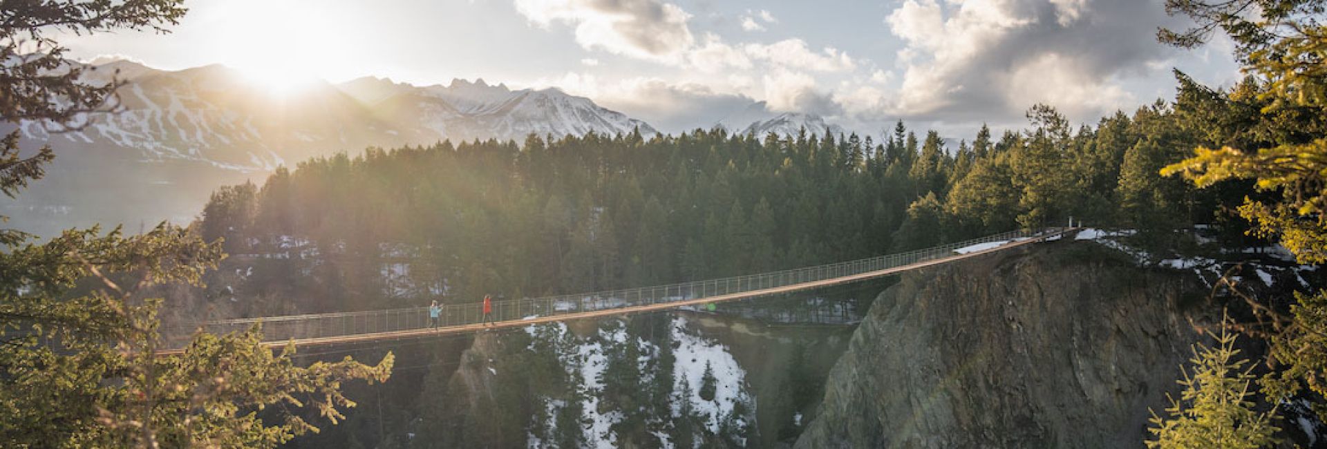 Experience breathtaking views of the Rocky Mountains. Family walks along a canyon edge, suspension bridges, a zipline, climbing wall and axe throwing await.