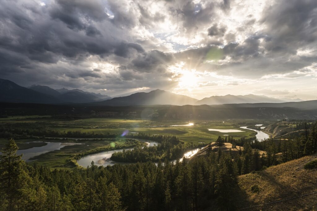The Old Coach Trail in Radium Hot Springs provides exceptional views of the Columbia River Valley. Positioned on the benchlands above the wetlands, the trail allows visitors to overlook the marshes and river channels below. Designated viewpoints along the route showcase expansive panoramas of wetland channels, marsh grasses, and prominent mountain ranges, notably the Purcell Mountains to the west.