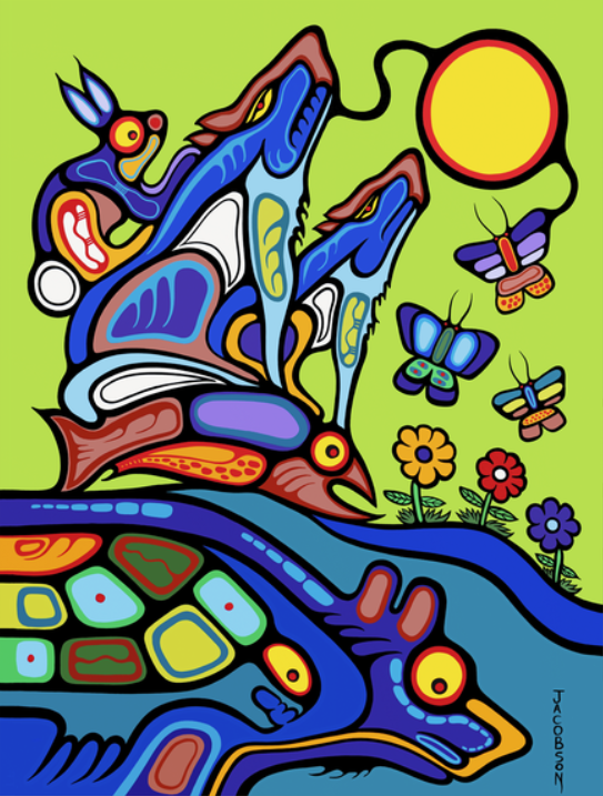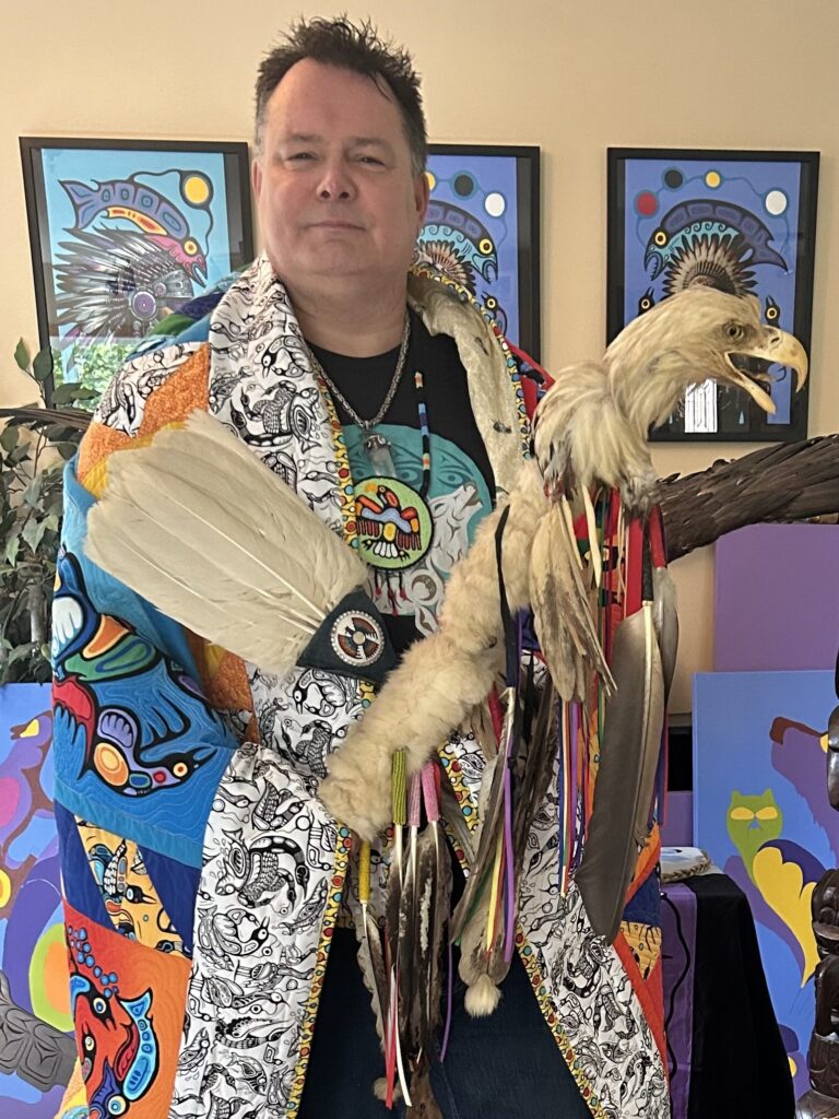 Imagination in Motion comes to life through the creative journeys of Mark Anthony Jacobson in Crawford Bay and Lisa Wood of Creston. Mark Anthony (known as Rainbow Thunderbird), is a renowned Anishinaabe (Ojibway) artist, author, and executive producer who has spent more than four decades expressing his culture through powerful visual storytelling. His work reflects a deep spiritual connection to the land, carrying forward the rich traditions of Woodland AI art while continuing to evolve its voice on an international stage.