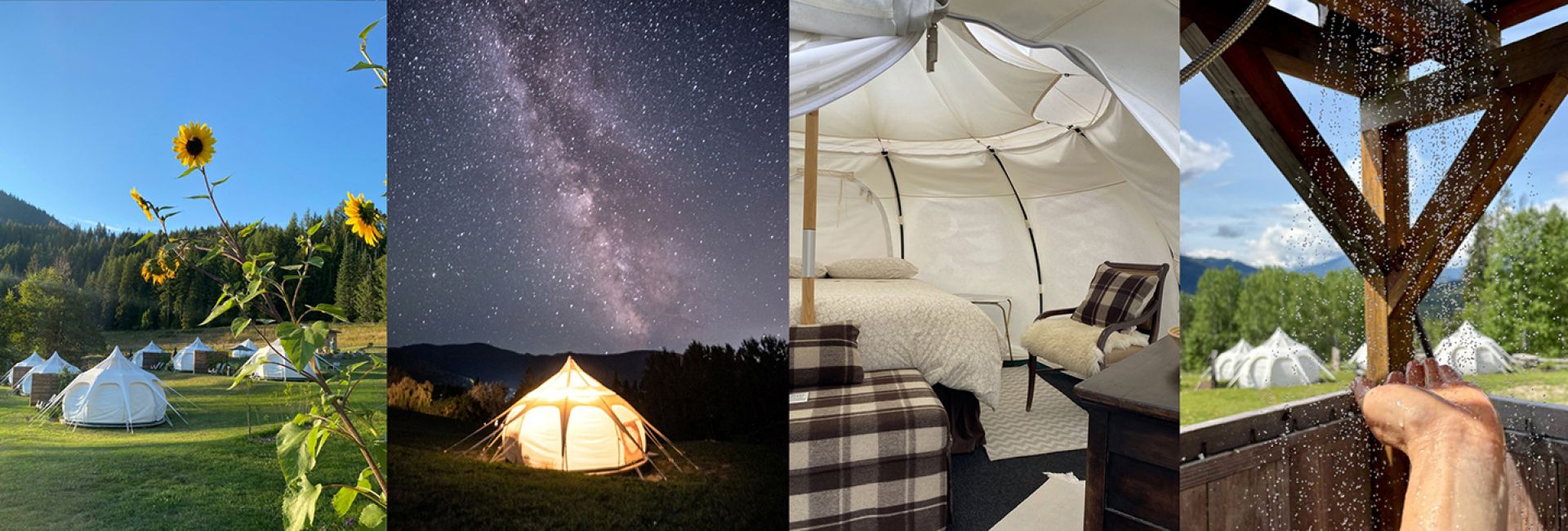 Choose from one of 6 walk-in glamping sites. It’s a short 2 minute walk up to your canvas Stargazer tent featuring romantic skylights. Gaze at stars from the comfort of bed. Fall asleep to the soothing sound of crickets with gentle breezes caressing your face. Wake up to the sweet fragrance of cedar forests, enjoy a leisurely cup of fresh ground coffee onsite, taste food picked fresh from the guest gardens and take in the sweeping views of the surrounding mountains.