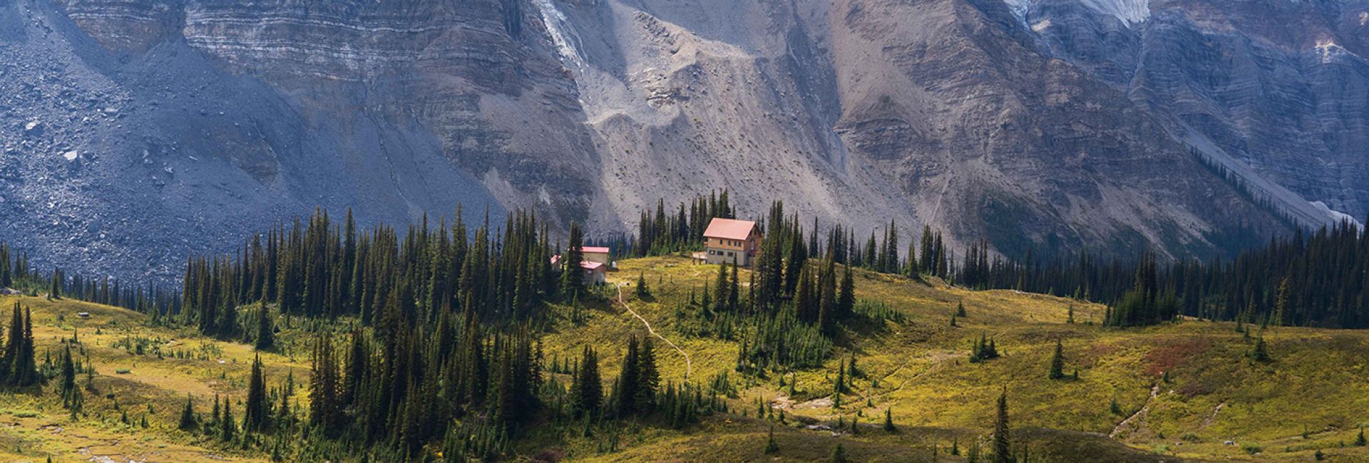 The chalet is situated north of Golden, on the snowy west side of the Rocky Mountains. It’s at tree line 2,088 m (6,850 ft), near the towering peaks of the Continental Divide. Surrounded by meadows and glaciers, the area provides a virtual playground for backcountry enthusiasts. The terrain is suitable for all levels of hiking and skiing ability.