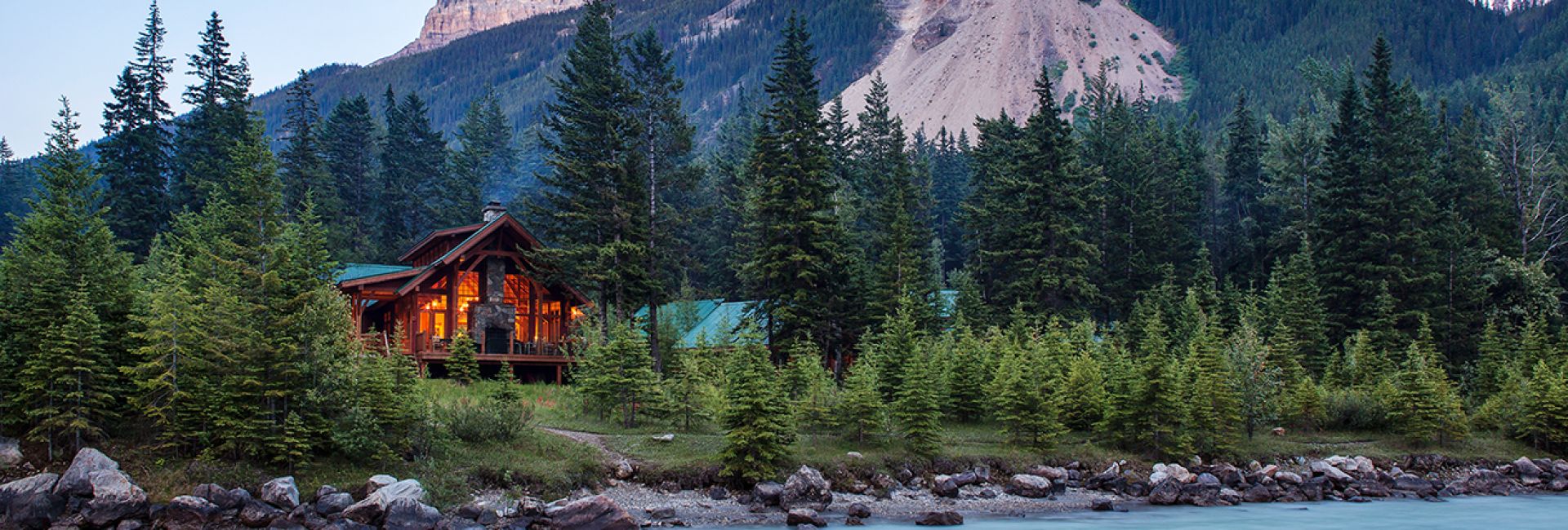 In the heart of the Canadian Rockies, 15 minutes from Lake Louise, Cathedral Mountain Lodge is perfectly situated on the edge of the Kicking Horse River, with Mount Stephen and Cathedral Mountain overlooking the timber frame lodge and its log cabins.