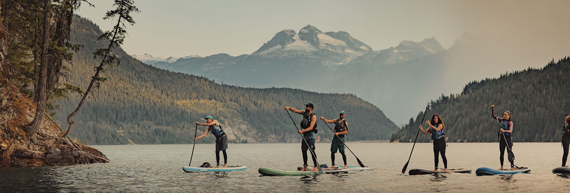 Downstream Adventure offers a Stand Up Paddle Board Cliff to Waterfall Tour on Lake Revelstoke. The paddle is north from the start of the lake.