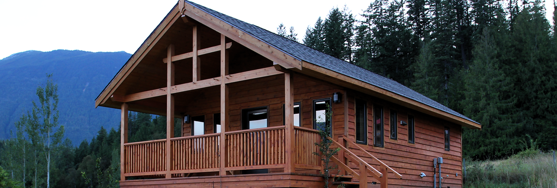 The modern chalet-style building is completely self-contained with a kitchen, laundry room, living room, bedroom with queen bed and combination bath. The front deck boasts views of the Purcell Mountains.