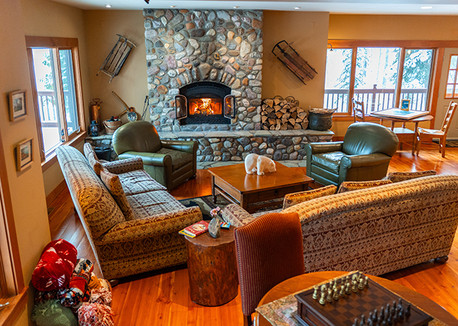 The lodge’s inviting main floor offers multiple gathering spaces, including a bar area—perfect for our après-ski cheese boards by the fire. Alternatively, relax on the sun deck with a glass of wine after a day hiking in the mountains.
